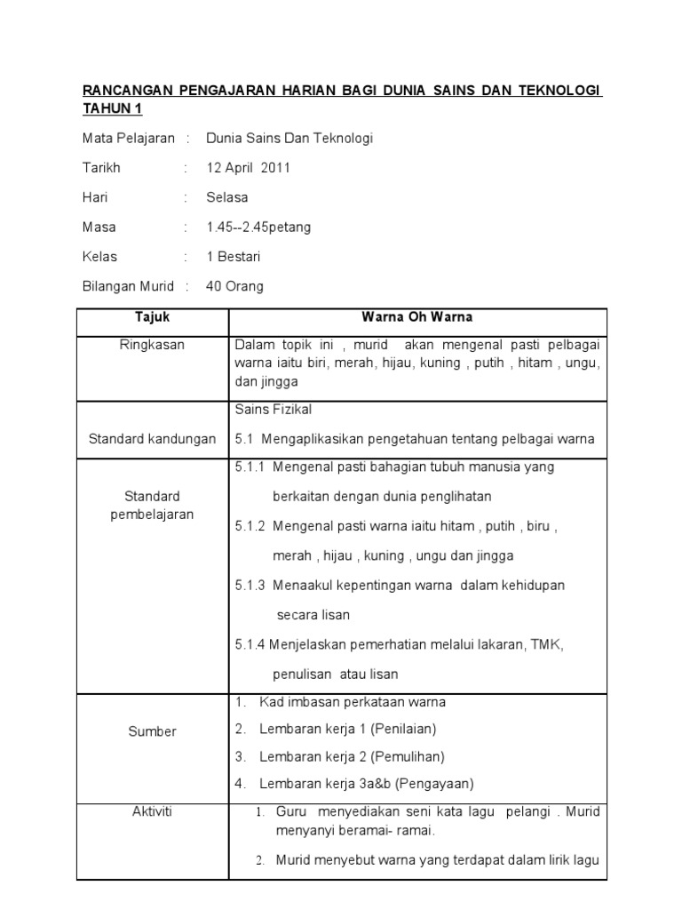 Penggabungjalinan Komponen fizikal kognitif kreativiti dan estetika rohani serta moral dan sosioemosi. Murid mendengar arahan guru secara bertatasusila. 09042019 tajuk contoh rancangan pengajaran harian rph pada kali ini adalah kenali warna.